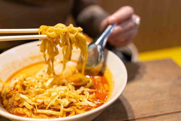 1. 咖喱面(Khao Soi):这是一道香浓的泰北面食,带有独特的椰奶与咖喱风味,通常搭配鸡肉或牛肉,配上脆脆的炸面条,深受游客喜爱。清迈的咖喱面可以说是招牌菜,来这里一定要尝尝!