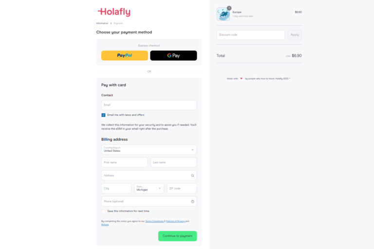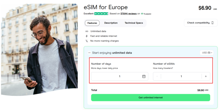 Let’s use Holafly as an example, but all international eSIM retailers work in a similar fashion. Here are the things that you need to know once you are ready to buy eSIM: