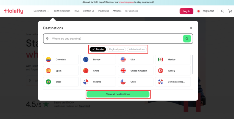 - Extensive coverage: Holafly offers an eSIM for over 200 destinations. You can easily choose the country or region where you want to use your phone.