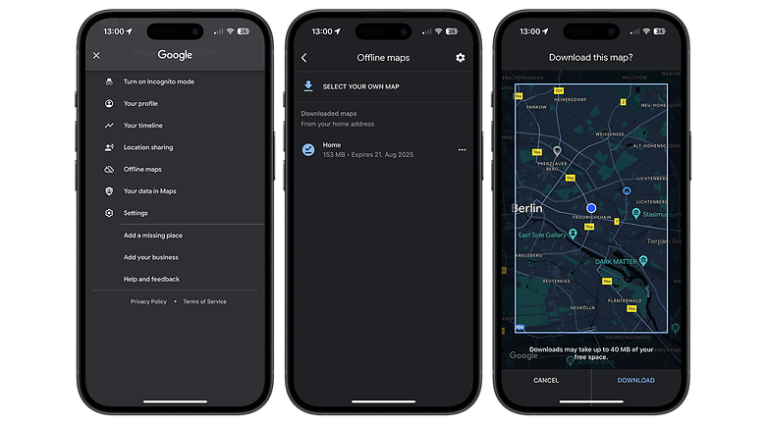 Außerdem kannst du mit Google Maps Karten offline speichern. Ob du eine ganze Stadt oder nur einen kleinen Teil herunterlädst – die Downloadgröße liegt meist zwischen 85 und 190 MB. Bei größeren Karten brauchst du natürlich mehr Datenvolumen!