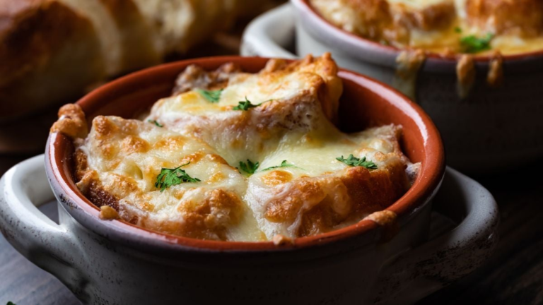 Sie begann als einfaches Marktessen, wurde aber rund um Les Halles berühmt, wo Restaurants sie nachts an Arbeiter und Nachtschwärmer servierten, die etwas Warmes und Stärkendes brauchten. Der Geschmack kommt von tief karamellisierten Zwiebeln, einer herzhaften Rinderbrühe und einem Schuss Wein für Frische. Geröstetes Baguette und geschmolzener Gruyère bilden die typische goldene Kruste obendrauf.