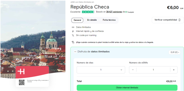 Este proveedor Francés ofrece una eSIM que te da cobertura en República Checa y 53 países más para que tengas internet en Europa, aunque su activación debe hacerse primero en Francia, por lo que deberás viajar allí antes de ir a Praga.