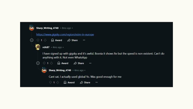 La conversación entre estos usuarios en Reddit refleja que la experiencia con la eSIM de GigSky varía según el viajero, algo que también se observa en otras plataformas de opinión y depende de factores como la cobertura y el destino seleccionado.