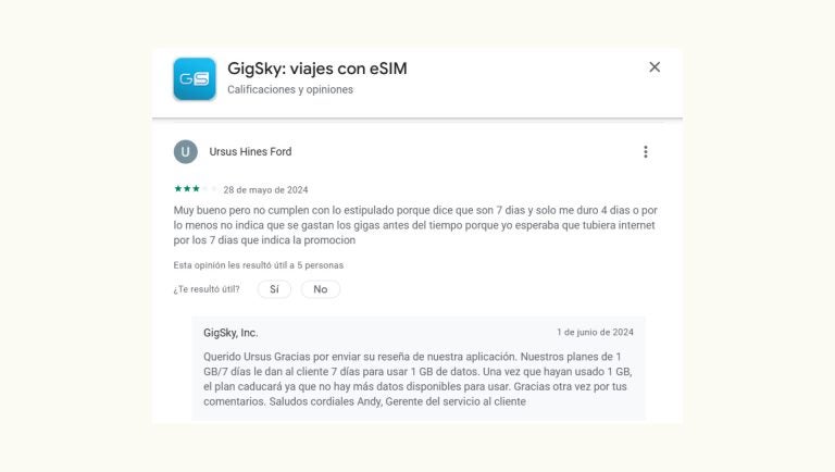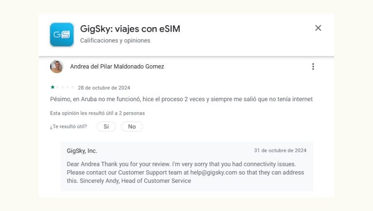 La opinión de Andrea Maldonado con una estrella en Google Play, refleja la insatisfacción con el servicio de GigSky debido a problemas de conexión durante su viaje a Aruba. Aunque la respuesta de la compañía es cortés, solo se limita a sugerir que se comunique con el equipo de servicio al cliente.