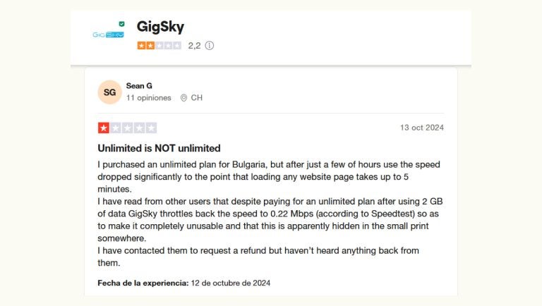 La opinión de Sean G, compartida en Trustpilot, señala un posible inconveniente con los planes ilimitados de GigSky. Tras consumir 2GB de su plan de datos, la velocidad de navegación se redujo drásticamente, advirtiendo que esta limitación se encuentra en la letra pequeña del contrato.