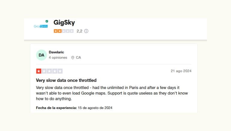 Entre tanto, la opinión compartida por Davelaric en Trustpilot también refleja algunos desafíos con los planes ilimitados de GigSky y su servicio de atención al cliente. Después de unos días la conexión pasó a ser muy lenta al punto de no poder utilizar aplicaciones básicas como Google Maps.