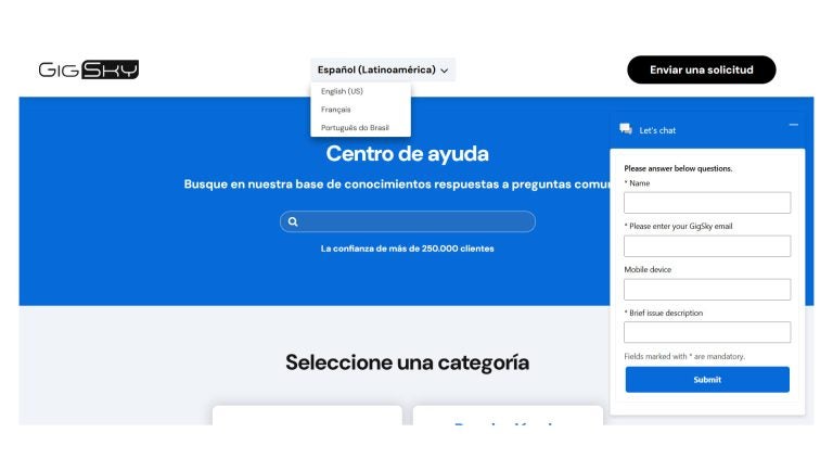 Al respecto, hay que decir que GigSky cuenta con varios medios en su página web para resolver las preguntas frecuentes de los usuarios pero no en tiempo real, como se muestra en la siguiente imagen: