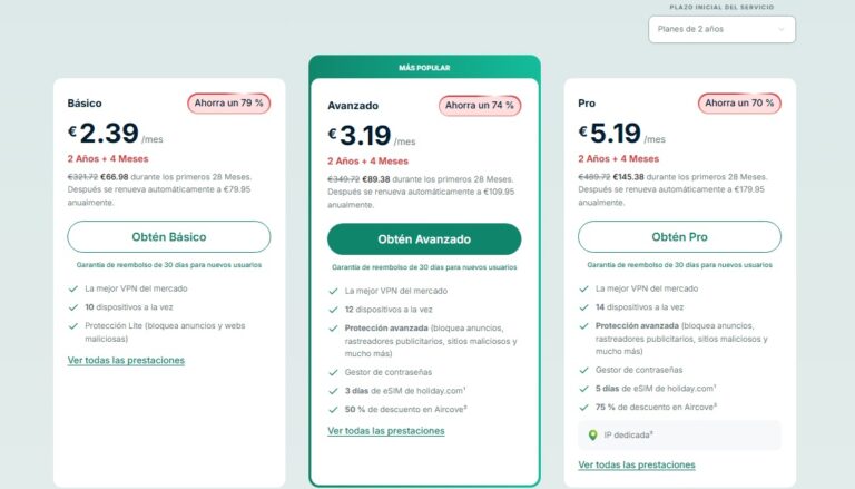 ExpressVPN, en cambio, no dispone de plan gratuito. Su propuesta es más directa: un servicio premium con todas las funciones activas desde el primer momento. El precio mensual es más alto, y aunque los planes anuales y bienales reducen el costo por mes, sigue siendo una de las VPN más caras del mercado.