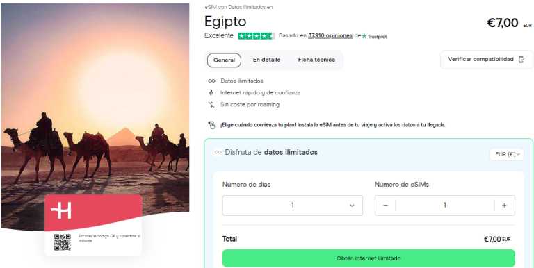 Por ello, sin dudarlo dos veces, llegamos a la conclusión de que la Tarjeta eSIM Egipto de Holafly es la mejor opción, porque te ofrece datos ilimitados desde 1 hasta 90 días a partir de los 7 euros.