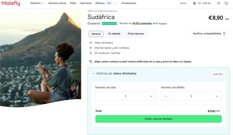 En Holafly encuentras una Tarjeta SIM virtual con datos ilimitados desde 8,90 EUR para conectarte en Sudáfrica. Puedes comprarla antes o durante el viaje.