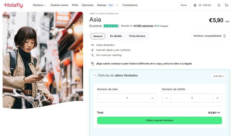 Con esta opción podrás seleccionar el idioma y la moneda que prefieras para tus compras en línea, simplificando el proceso y evitando posibles confusiones. Holafly ofrece planes ilimitados desde 5,90 EUR para diferentes días de uso.