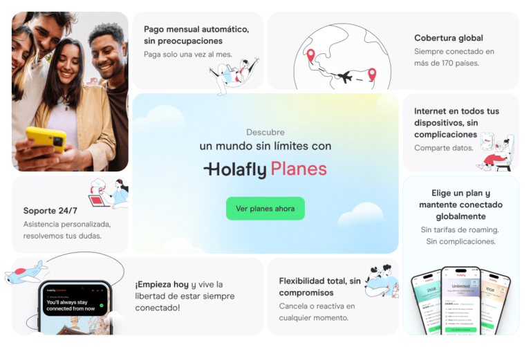 Holafly Plans es un servicio que ofrece planes globales de internet. Está basado en la tecnología eSIM, no necesita ningún dispositivo físico adicional para funcionar. Se instala digitalmente en el móvil del usuario y permite acceder a internet en más de 170 países sin necesidad de cambiar de tarjeta. Algunas de las características por las que se ha vuelto popular entre los viajeros con grandes necesidades de conectividad son: