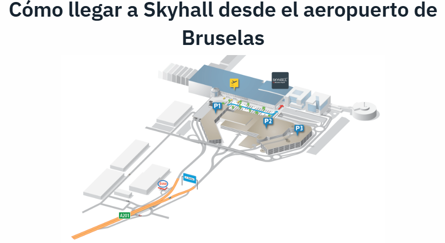 - Tren: la estación de tren de Brussels Airport – Zaventem está conectada directamente con el aeropuerto. Desde allí, puedes tomar un autobús o un taxi hasta el recinto SkyHall en unos 20 minutos y con un coste aproximado de $11 (€10) por trayecto.