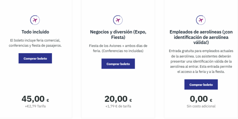 Si trabajas para alguna aerolínea como piloto, tripulante de cabina, ingeniero o despachador, la entrada es gratis. Recuerda que tendrás que presentar una identificación válida, que incluye el acceso a la feria y a la fiesta, pero no a las conferencias. Estas son las tarifas y tickets que puedes comprar en la web oficial de Pilot Expo 2026 del evento antes del 21 de febrero: