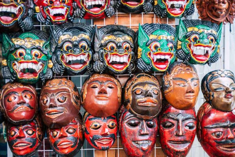 Les masques en bois jouent un rôle important dans les danses rituelles balinaises. Chaque masque incarne un personnage précis : divinité, démon ou figure mythologique. Ils sont souvent sculptés à la main dans des villages comme Mas ou Ubud.