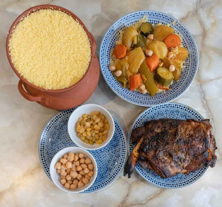 La semoule de blé disposée dans un plat traditionnel est accompagnée de légumes et de viandes mijotées (bœuf, mouton, poulet). Si à l’origine, le couscous marocain était partagé en famille après la prière de dhuhr du vendredi, aujourd’hui, il se déguste au quotidien.