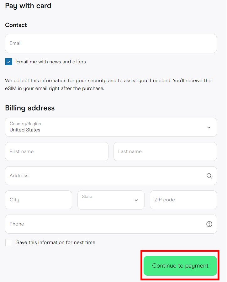 Once you have filled out the form, you click “Continue to payment” to complete the purchase of your unlimited data eSIM.