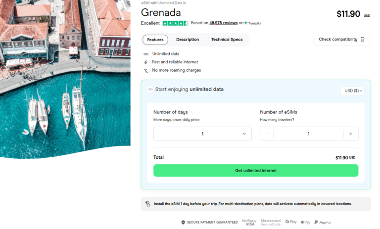 Holafly is an online store that stands out for its excellent eSIMs that offer great internet coverage, no matter which country you visit. That’s why if you are looking for an eSIM for your trip soon, then Holafly’s eSIM card for Grenada could be the best option. You can get plans with unlimited data and custom days, so you’ll be able to get an eSIM for the days you need.