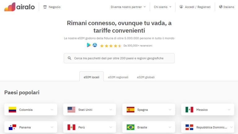 Per la maggior parte delle destinazioni è possibile scegliere tra piani dati standard o illimitati, entrambi con un’opzione di durata fissa, di solito con 3 o 4 opzioni tra cui scegliere. I prezzi sono indicati in euro e in italiano. Non è incluso alcun numero di telefono locale, è disponibile solo Internet. Puoi installarla con un codice QR.