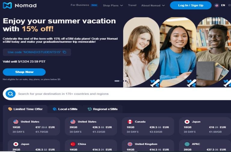 Il prossimo fornitore che analizzeremo è Nomad, che ha un’ottima valutazione e recensione su Trustpilot dopo Holafly, e i viaggiatori che lo hanno provato hanno avuto una buona esperienza e diverse opinione su vari aspetti. Ha oltre 100 destinazioni locali per Paesi come gli Stati Uniti, Turchia o il Giappone e regionali com Asia con velocità 4G e 5G in generale e si connette a diverse rete locali con una buona copertura.