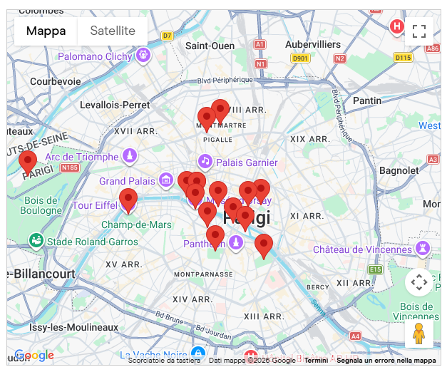 Per tua comodità, abbiamo creato una mappa di Google con i segnaposti delle principali attrazioni turistiche di Parigi. Puoi utilizzare la mappa incorporata qui sotto per valutare la distanza tra i vari luoghi, pianificare l’itinerario e salvare i segnaposti nella tua mappa di Google Maps.