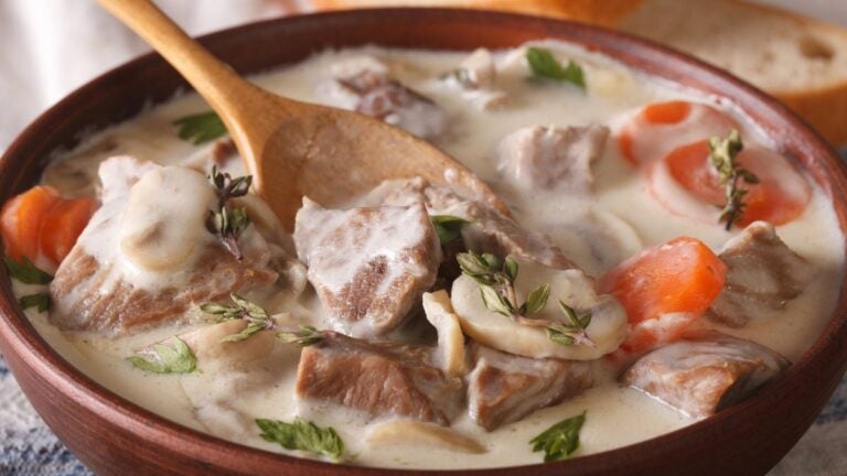 Il piatto è composto da tenera carne di vitello in una cremosa salsa bianca. La carne di vitello viene cotta a fuoco lento fino a diventare incredibilmente tenera, quindi completata con una salsa vellutata a base di brodo di cottura, panna e tuorlo d’uovo. Il piatto include carote, cipolline e funghi, il tutto ricoperto da una salsa vellutata.