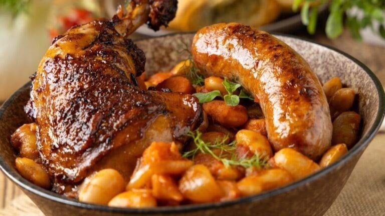 Il piatto combina fagioli bianchi, confit d’anatra, salsiccia di maiale e, talvolta, agnello, il tutto cotto lentamente fino a quando i sapori si amalgamano. La superficie forma una crosta dorata grazie al pangrattato e al grasso fuso.
