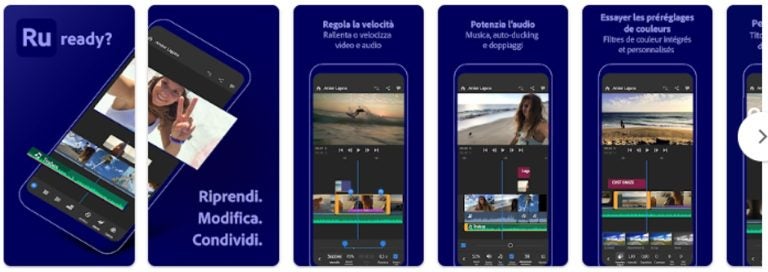 Sarai in grado di condividere i tuoi video nel formato che desideri per i tuoi social media. L’editor Adobe Premiere Rush ti permette di modificare i contenuti dei tuoi video, controllare la velocità, scegliere i colori, usare l’ audio, efetti e la possibilità di giocare con le transizioni, una delle migliori applicazioni.