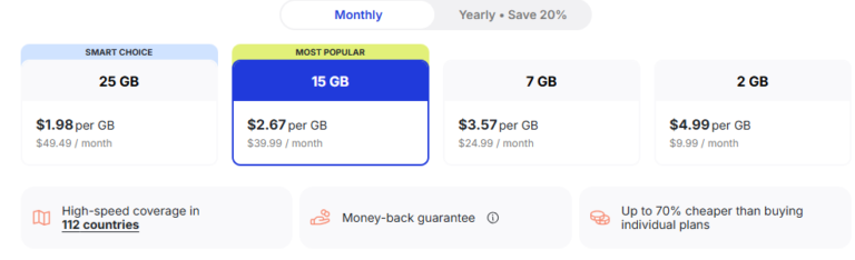 - Piano globale 15 GB: è il piano più popolare, con un prezzo di 39,99 $ (34,35 €) al mese.