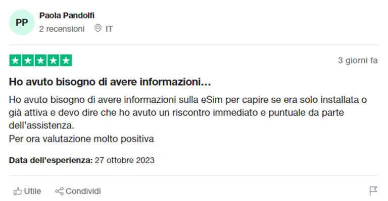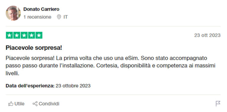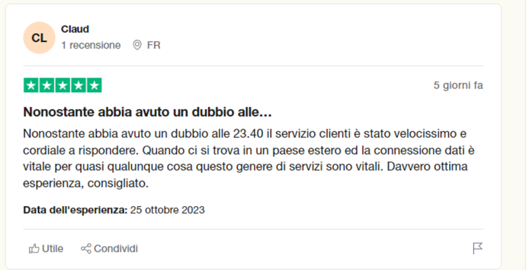 Ho comprato due esim. Il primo ha funzionato perfettamente su un iPhone 1Pro. Non appena il dispositivo è arrivato in Francia (dal Perù) aveva già la connessione internet. Invece il mio Samsung Galaxy S21+ non ha funzionato per niente, non sono riuscito ad installare l’esim. Ho contattato il team clienti e mi hanno concesso un rimborso e uno sconto per il mio prossimo acquisto al fine di risolvere il problema. Davvero utile!