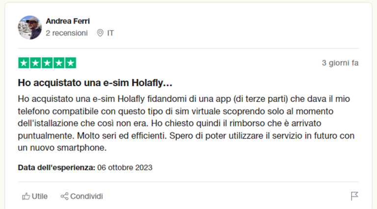 La eSIM di Holafly ha una durata specifica che dipende dalla durata del viaggio; una volta scaduto il tempo, smette di funzionare. Nel caso in cui tu abbia acquistato una eSIM Holafly e il tuo telefono non sia compatibile, come hai potuto vedere nelle recensioni, è molto semplice contattare il servizio clienti Holafly e chiedere un rimborso.