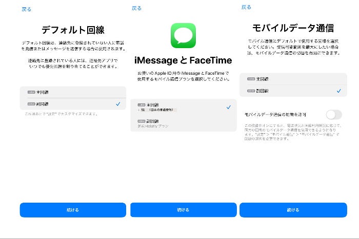 eSIMの設定が完了した後、デフォルト回線、iMessageとFaceTime、モバイルデータ通信の回線を選んで作業が終了します。