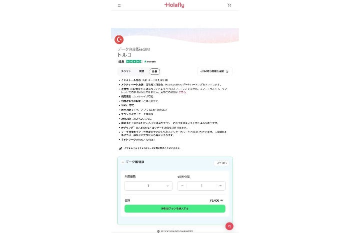 HolaflyのトルコeSIMの価格は、選択する利用期間によって異なります。