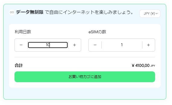 例えば、10日間利用したい場合、データ無制限プランの料金は4,100円と、一日500円以下なのでお得感あります。