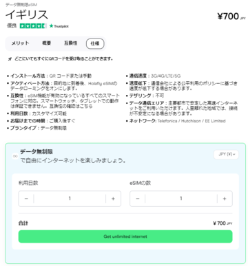 Holaflyが提供するイギリス向けプリペイドeSIMは、無制限のデータプランを提供しています。