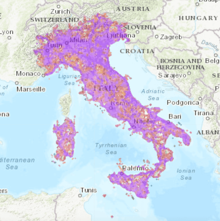 TIM은 이탈리아 전역에 걸쳐 탄탄한 5G/4G/LTE 네트워크를 갖추고 있는데요. 아래 커버리지 지도에서 여행 지역의 커버리지를 확인해 보세요. 보라색이 5G, 붉은 색은 4G 속도를 나타냅니다.