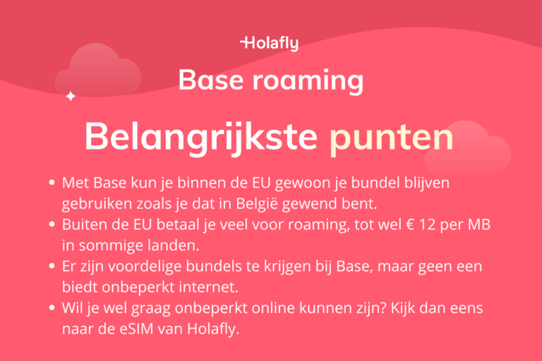 Roaming bij Base is prima, zolang je binnen de EU reist. Je belt, sms’t en surft gewoon uit je bundel, net alsof je thuis in België bent. Maar zodra je buiten Europa reist, kan roaming bij de provider flink in de papieren lopen. Soms betaal je tot wel € 12 per MB, dat is alsof je elke keer dat je Instagram opent een dure cappuccino afrekent.