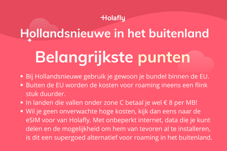 In dit artikel lees je hoe roaming bij Hollandsnieuwe werkt, wat de kosten zijn, en hoe je voorkomt dat je zonder internet komt te zitten. Ook stellen we handige alternatieven, zoals de Holafly eSIM aan je voor. Lees dus snel verder.