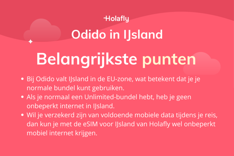 We vertellen je ook meer over een alternatief: de eSIM voor IJsland van Holafly. We leggen uit waarom dit een goede keuze kan zijn in plaats van je Odido-bundel te gebruiken, zelfs als je een Unlimited-bundel hebt van Odido. Holafly houdt al meer dan 7 jaar reizigers verbonden met het thuisfront, en biedt een eSIM-oplossing voor meer dan 250 bestemmingen wereldwijd.