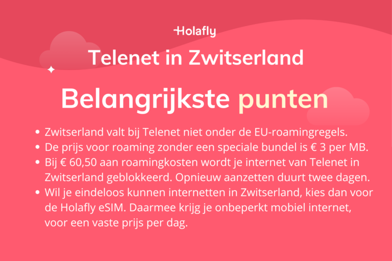Je kunt een lokale simkaart aanschaffen of een speciale bundel van Telenet kopen. Wil je zonder zorgen internetten in Zwitserland tegen een lage prijs, kies dan voor de eSIM van Holafly met onbeperkte data.