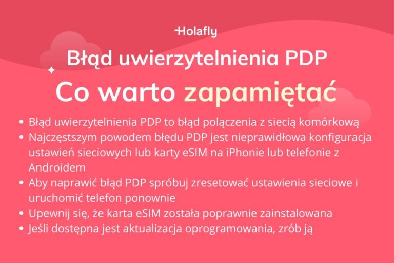 Błąd jest często spowodowany problemem z konfiguracją karty eSIM lub ustawień sieci komórkowych. Ten błąd pojawia się na telefonie jako “błąd uwierzytelnienia PDP”. Jak sama nazwa wskazuje, jest to błąd związany z autoryzacją w sieci komórkowej.