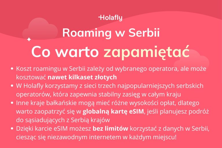 Niestety, opłaty za transfer danych w Serbii mogą wynosić nawet kilkaset złotych, w zależności od warunków Twojego operatora. Na szczęście wizyta w tym pięknym kraju nie musi wiązać się z wysokimi kosztami za roaming.