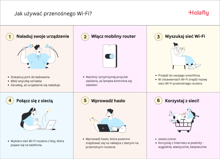 Korzystanie z pocket WiFi jest szybkie i proste. Wystarczy naładować urządzenie, włączyć je i połączyć się z siecią WiFi. Poniżej prezentujemy krótką instrukcję krok po kroku.