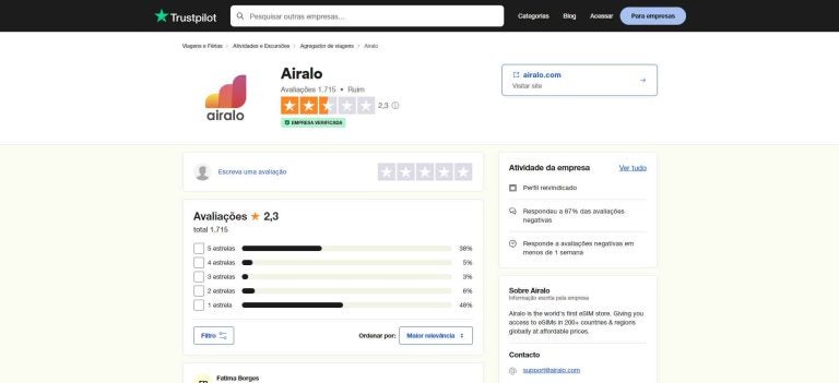 Tanto no Trustpilot, quanto no Reclame Aqui, a Airalo possui avaliações e reclamações de clientes. No primeiro site, a nota dada a empresa é de 2,3/5. Já no segundo, o Reclame Aqui, não possui notas nem um perfil verificado, possuindo uma reputação não confiável, com 27 reclamações e 3,7% respondidas. Portanto, este é um bom parâmetro para avaliar a experiência dos serviços dessa marca.