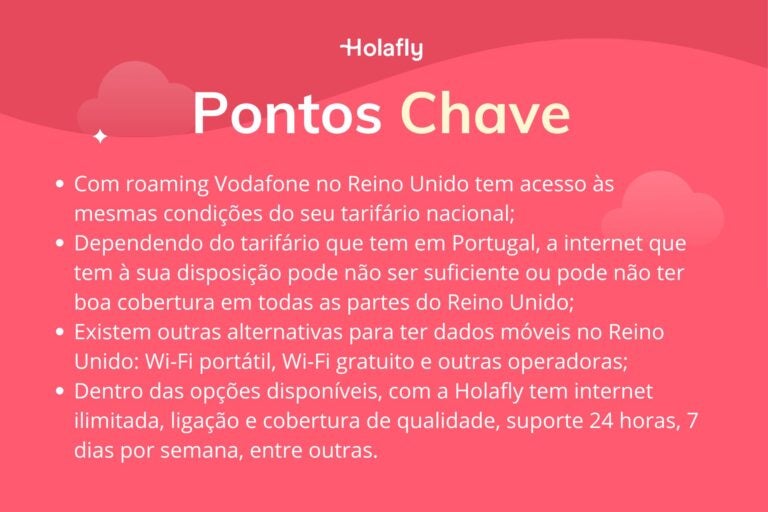 Para além do roaming da Vodafone para o Reino Unido e do cartão eSIM Reino Unido da Holafly existem outras alternativas para ter acesso à internet durante a sua viagem. Veja as alternativas abaixo: