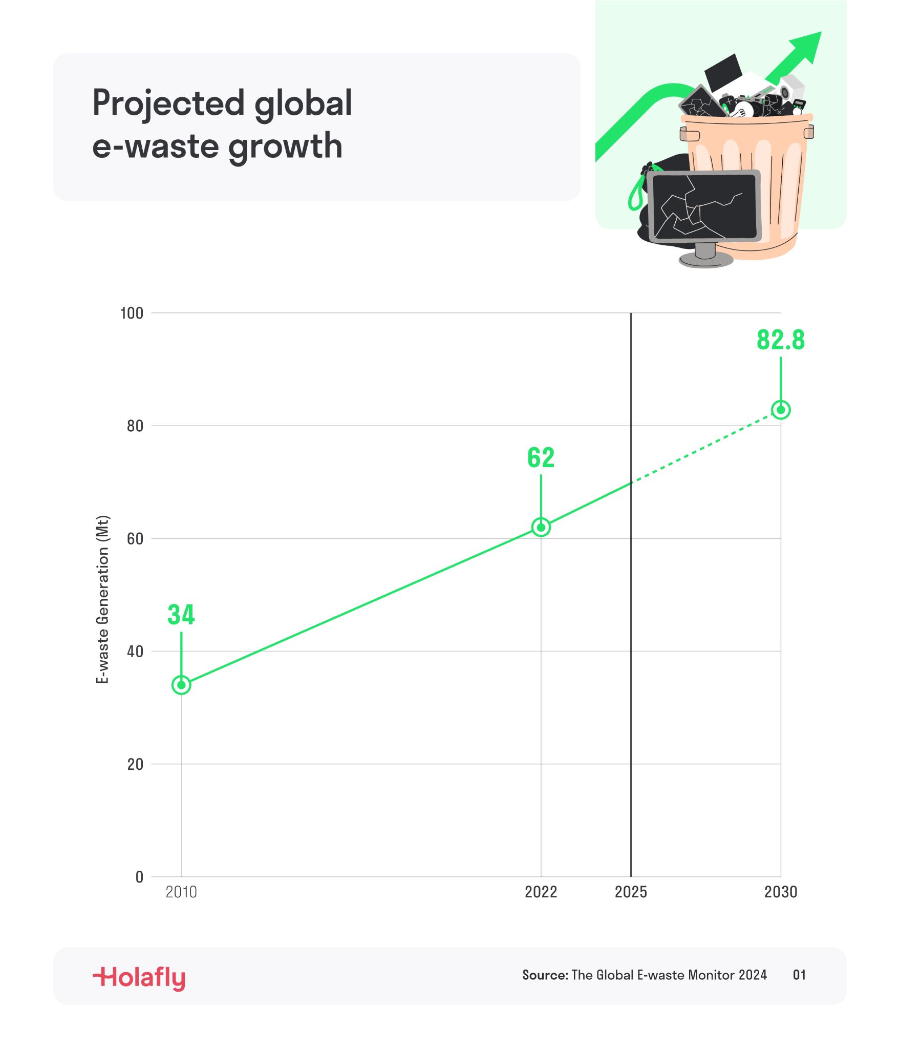 - At the current annual growth rate, global e-waste is set to rise to 82 million tonnes by 2030
