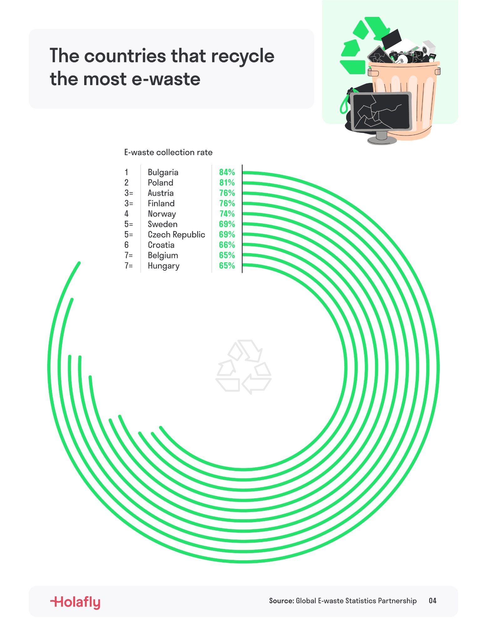 - On the other hand, Bulgaria tops the list for e-waste recycling rates, collecting an impressive 84% of its electronic waste, followed closely by Poland (81%)