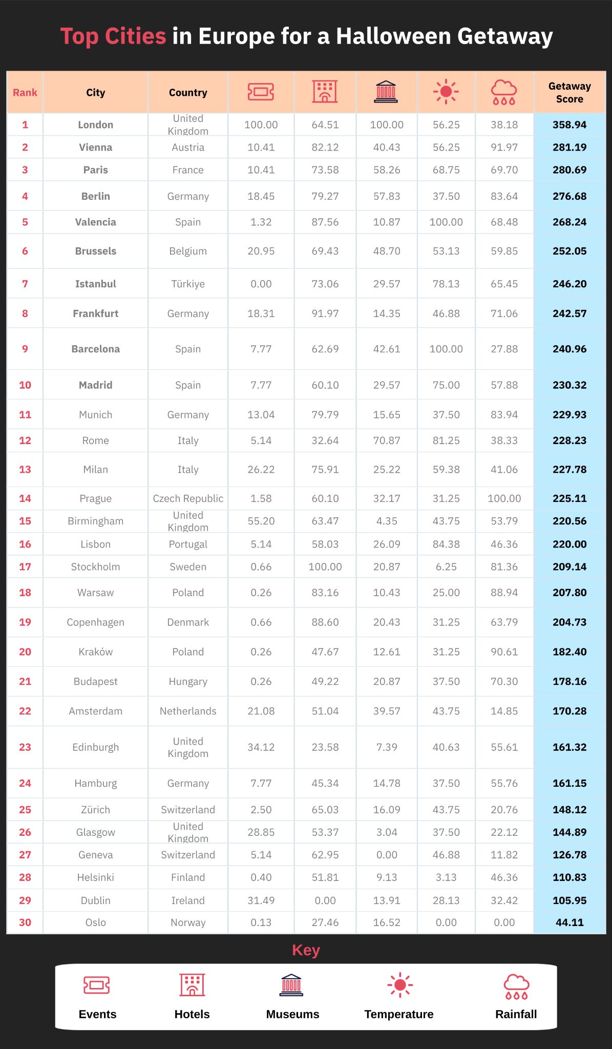 Each factor was given a score out of 100, creating a Halloween Getaway Score out of 400, helping us uncover destinations that offer the ideal mix of seasonal fun, comfort, and affordability.