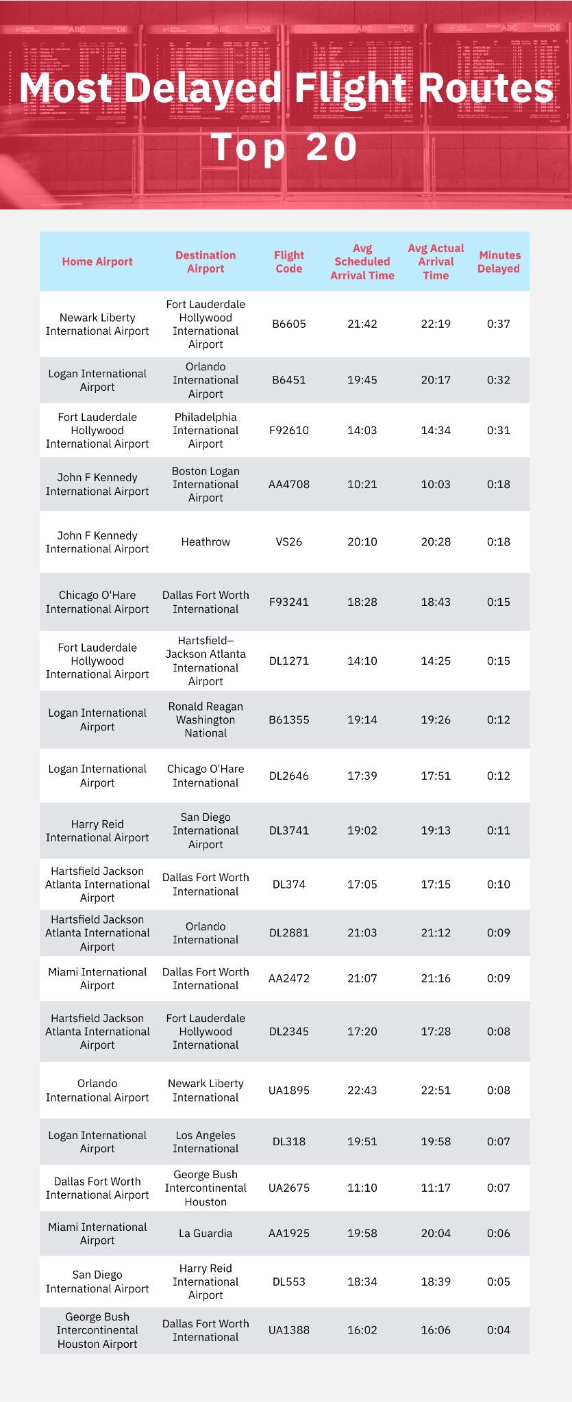 The findings revealed that Newark Liberty international to Fort Lauderdale Hollywood International, is the most likely delayed flight route, with an average delay of 37 minutes.