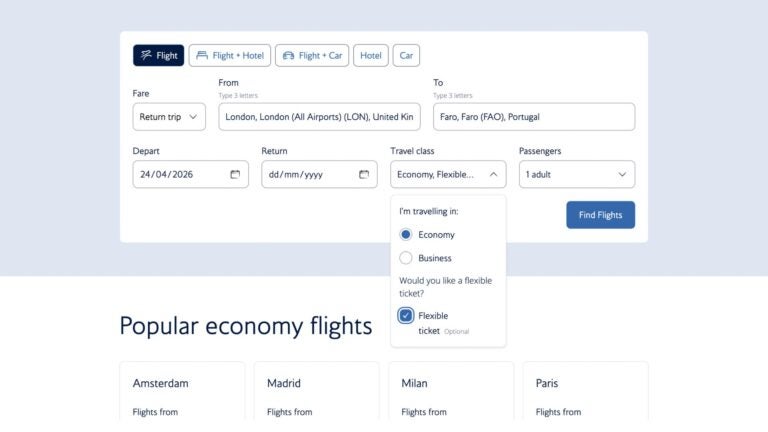 - Choose the right fare type: Airlines show multiple fare types for each flight, including basic, standard, and flex. Some airlines, such as British Airways, offer flexible tickets for both Economy and Business Class flights.